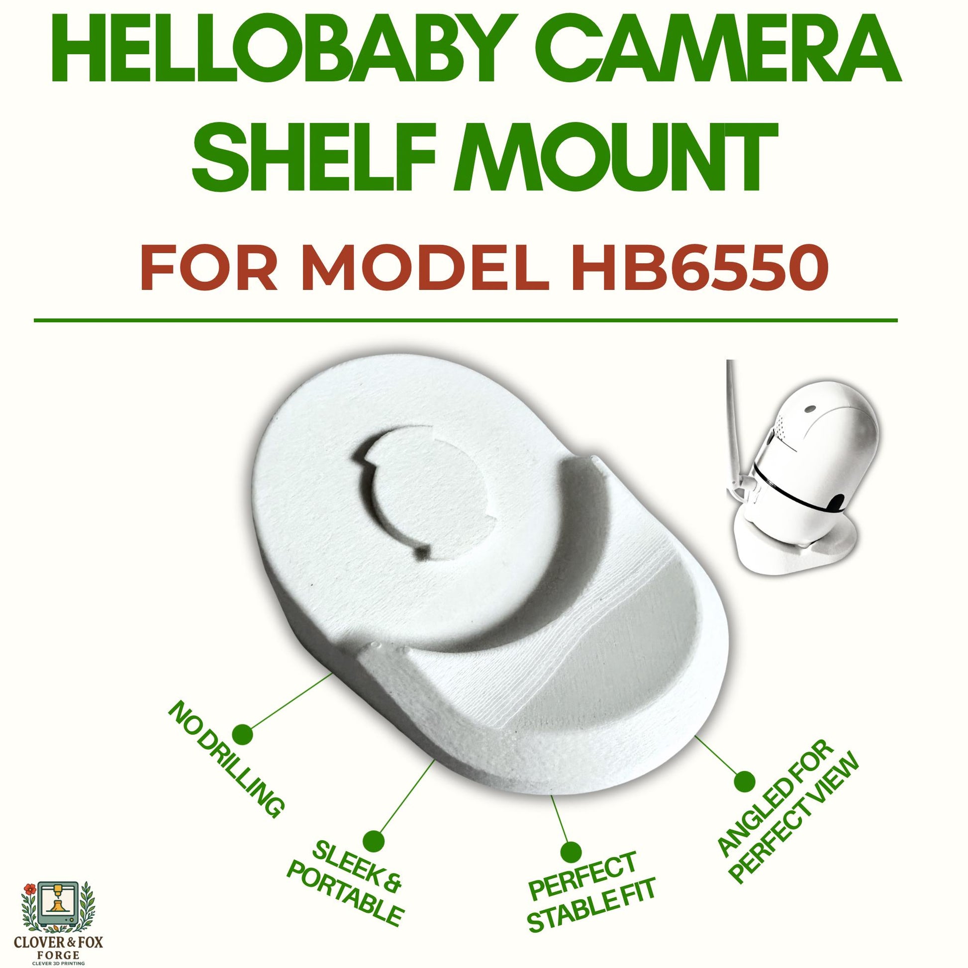 This sturdy 30° shelf stand was designed specifically for the HelloBaby HB6550 camera — no screws, no sticky pads, just a snug, wobble-free fit that stays put.